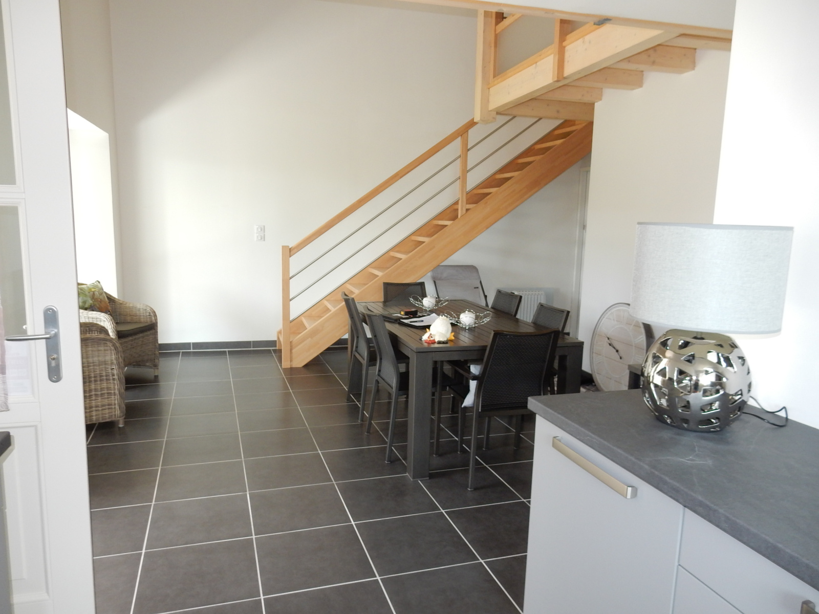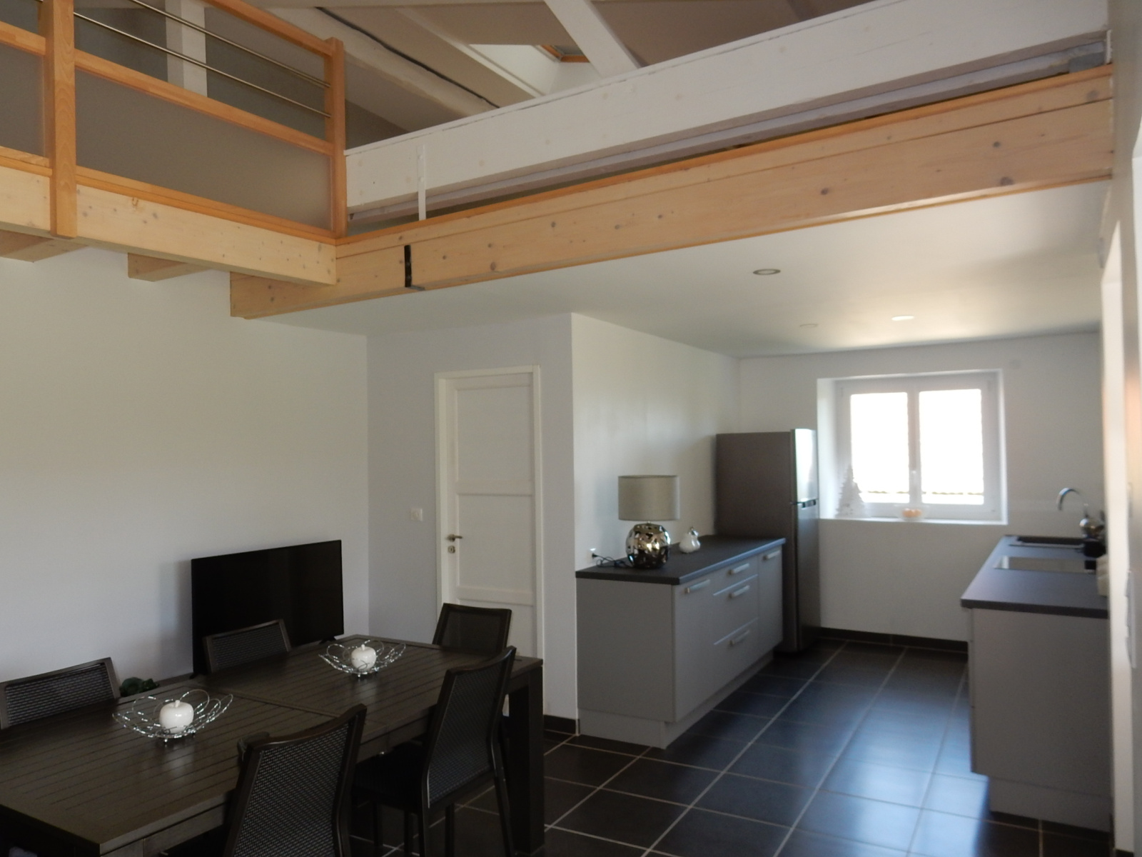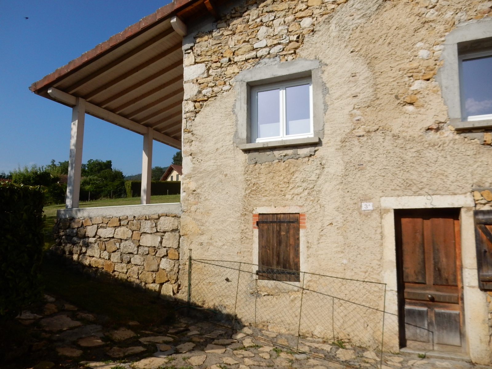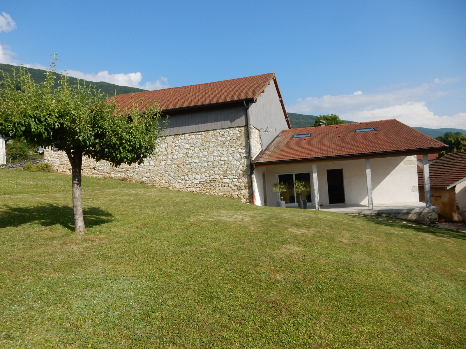 Injoux-Génissiat (01200)Située à 12 km de Bellegarde et gare TGV, à Craz (commune d’Injoux-Genissiat 01200), jolie maison en Pierre (entièrement rénovée) de 64m²hab de type 3, comprenant une cuisine équipée ouverte sur un salon/séjour, 1 chambre au rez-de-chaussée, une salle de douche et toilette, à l‘étage une mezzanine (31m² au sol), une Terrasse couverte, un s/sol avec caves. Dépendance : une grange de 63m² au sol à exploiter, le tout sur 659m² de terrain. Très belle vue dégagée sur les Alpes et Mont Blanc. Très calme.
